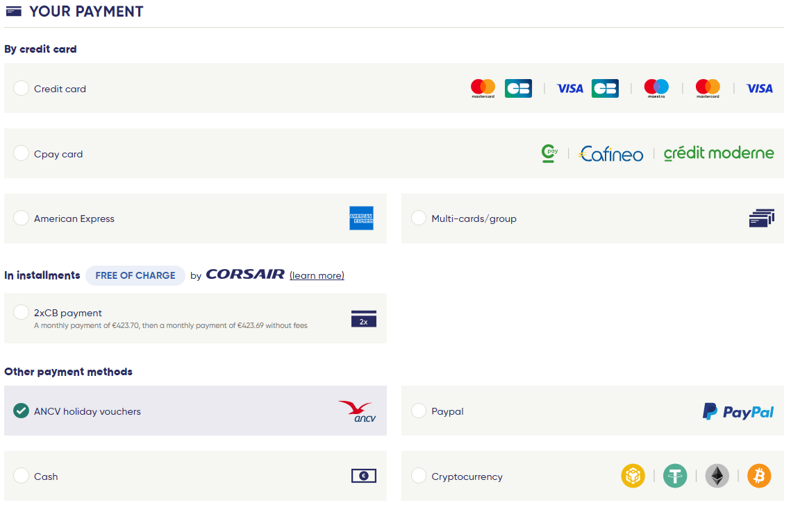 If you prefer to pay in cash for your online booking, we offer this option for a maximum basket of €1000 and only for transactions in Euros (€). This payment method is both simple and secure, available through our partner SKYLR.