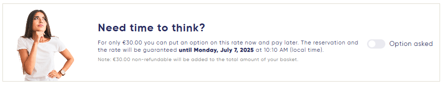 This service is available from €10. It is valid only on our website and must be paid in full by credit card no later than the deadline indicated during the booking process. Option fees are non-refundable, even if you do not complete the purchase.